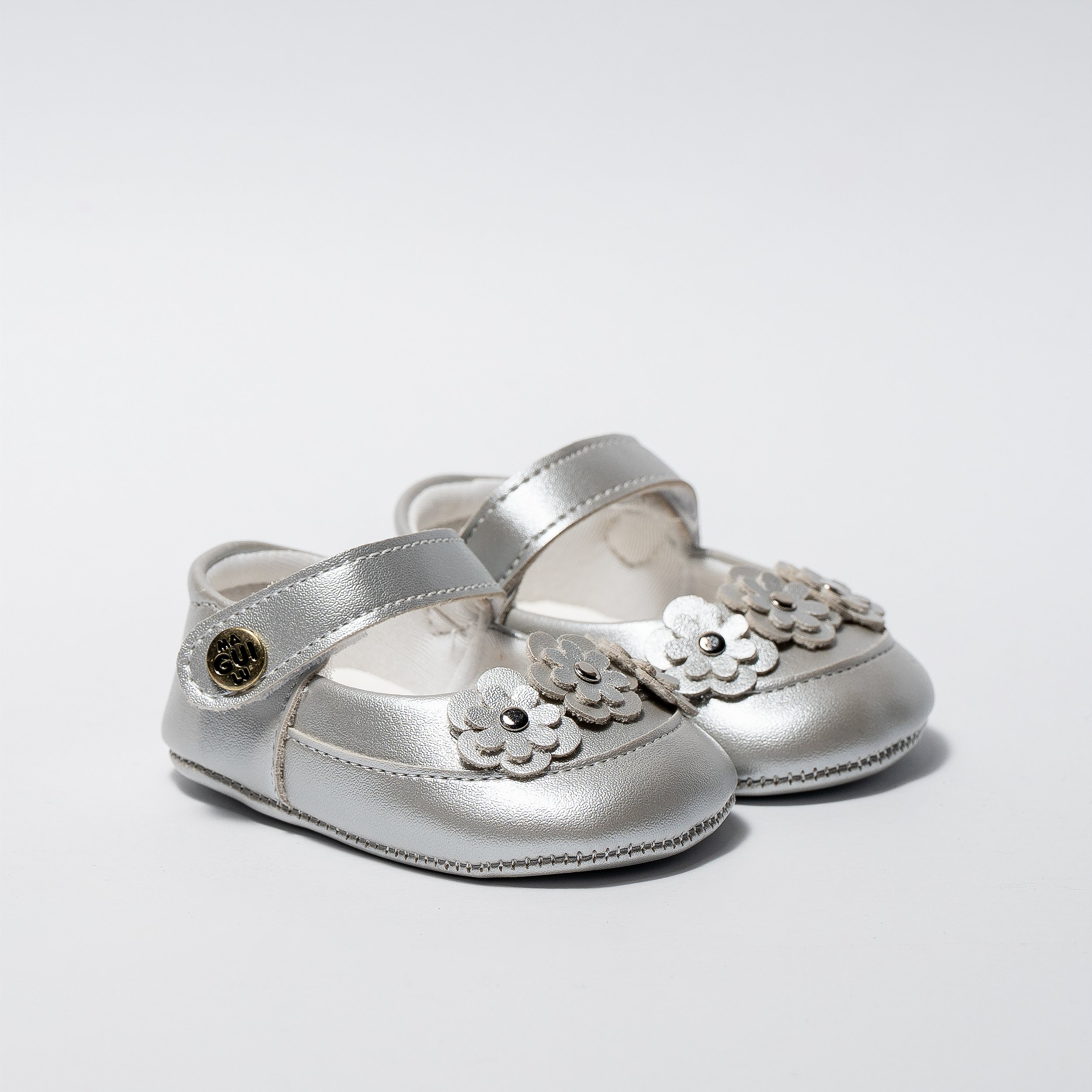 SAPATILHA SOFISTICADA - PRATA - 3 FLORES DUPLAS - MATERIAL LAMINADO - LINHA BABY